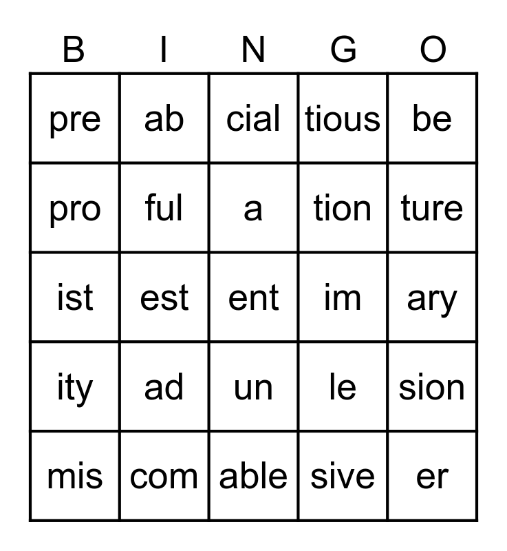 This bingo card has a free space and 24 words: ad, com, a, mis, be, pre, pro, ab, im, un, tion, ist, le, sion, ful, sive, ary, cial, ture, est, er, ity, tious and able.
