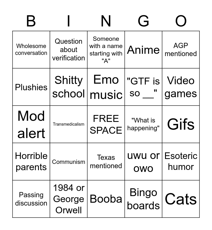 This bingo card has a free space and 24 words: Communism, 1984 or George Orwell, Emo music, Passing discussion, AGP mentioned, Wholesome conversation, Plushies, Question about verification, "What is happening", Texas mentioned, "GTF is so __", Mod alert, uwu or owo, Esoteric humor, Shitty school, Bingo boards, Gifs, Someone with a name starting with "A", Video games, Transmedicalism, Cats, Horrible parents, Anime and Booba.
