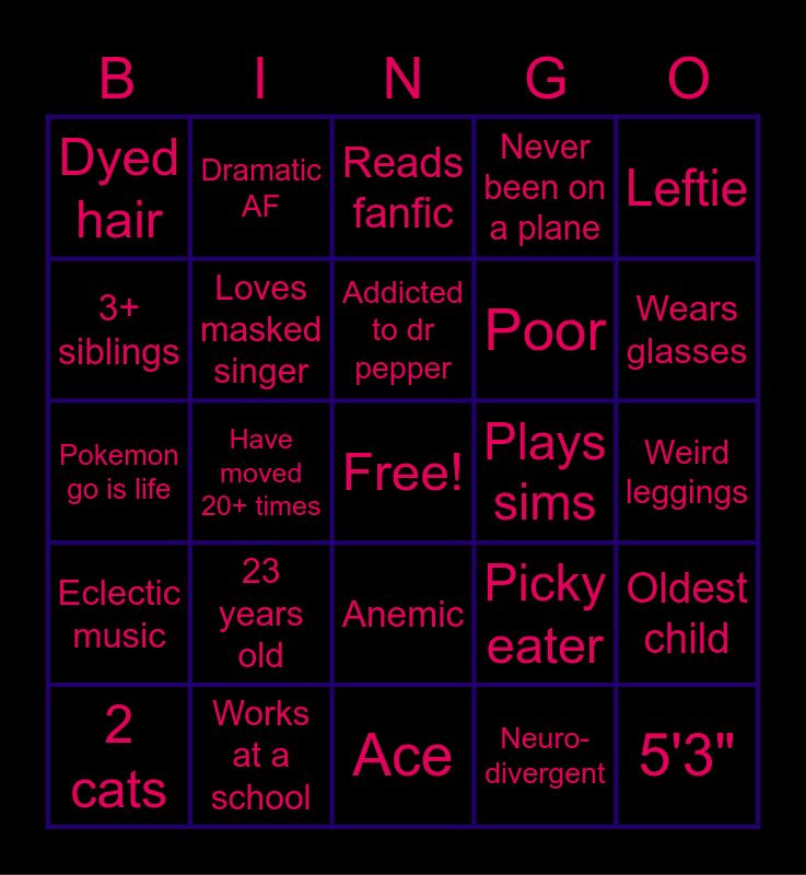 This bingo card has a free space and 24 words: 23 years old, Works at a school, Addicted to dr pepper, 2 cats, Leftie, Dyed hair, 3+ siblings, Dramatic AF, Plays sims, Anemic, Poor, Pokemon go is life, Picky eater, Oldest child, Loves masked singer, Neuro- divergent, Weird leggings, Reads fanfic, Wears glasses, Have moved 20+ times, 5'3", Eclectic music, Never been on a plane and Ace.