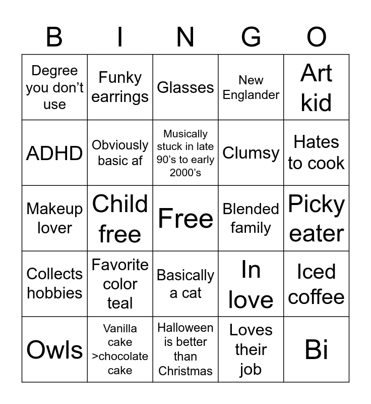 This bingo card has a free space and 24 words: Favorite color teal, Vanilla cake >chocolate cake, Musically stuck in late 90’s to early 2000’s, Owls, Art kid, Degree you don’t use, ADHD, Funky earrings, Blended family, Basically a cat, Clumsy, Makeup lover, In love, Iced coffee, Obviously basic af, Loves their job, Picky eater, Glasses, Hates to cook, Child free, Bi, Collects hobbies, New Englander and Halloween is better than Christmas.