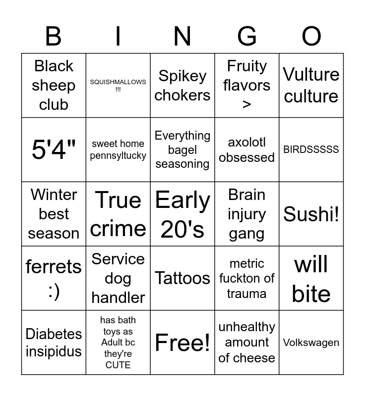 This bingo card has 25 words: ferrets :), has bath toys as Adult bc they're CUTE, Early 20's, unhealthy amount of cheese, Vulture culture, Black sheep club, SQUISHMALLOWS !!!, Spikey chokers, Brain injury gang, will bite, 5'4", sweet home pennsyltucky, Free!, metric fuckton of trauma, BIRDSSSSS, Diabetes insipidus, True crime, Everything bagel seasoning, axolotl obsessed, Sushi!, Winter best season, Service dog handler, Tattoos, Fruity flavors > and Volkswagen.