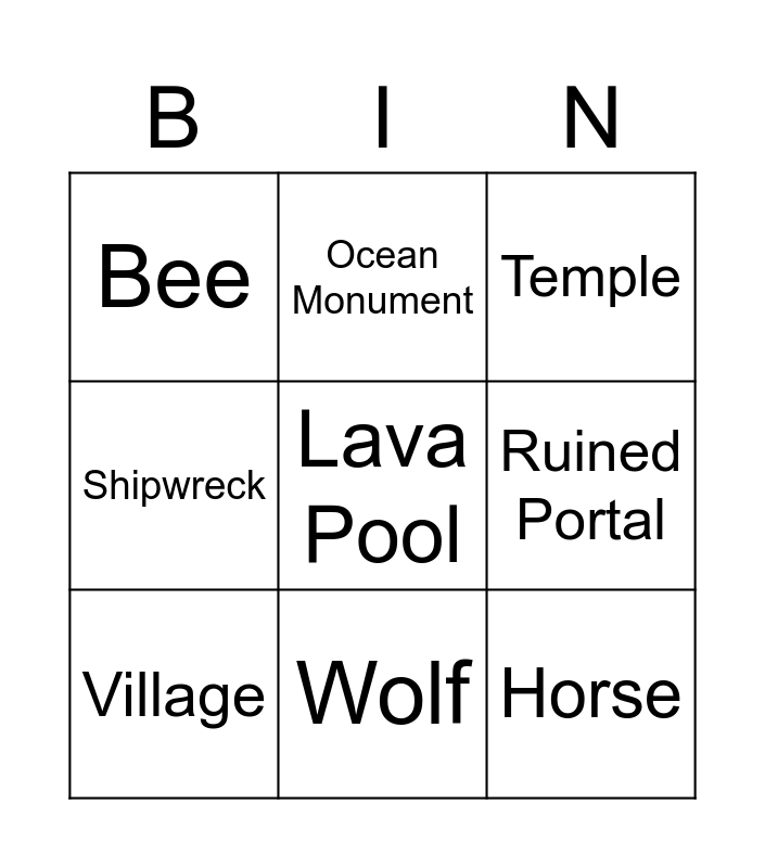 This bingo card has 9 words: Village, Temple, Ocean Monument, Shipwreck, Bee, Ruined Portal, Lava Pool, Horse and Wolf.