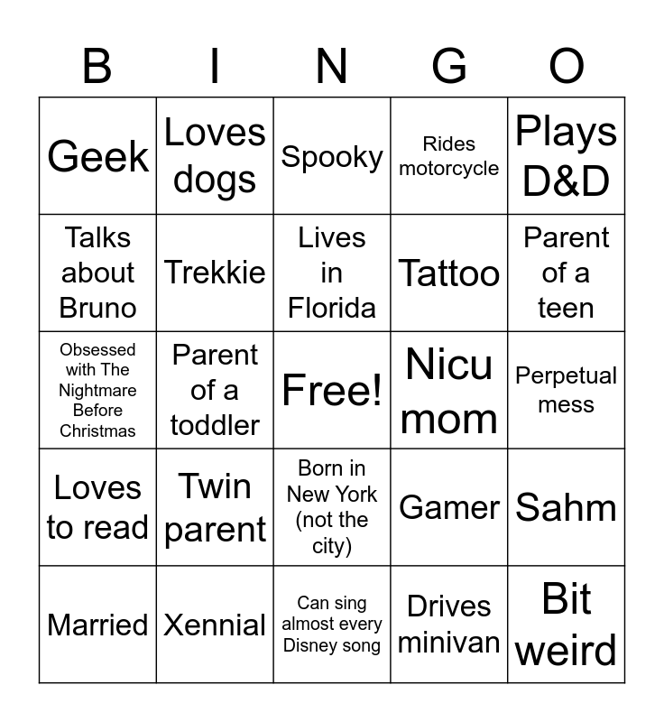 This bingo card has a free space and 24 words: Twin parent, Xennial, Lives in Florida, Married, Plays D&D, Geek, Talks about Bruno, Loves dogs, Nicu mom, Born in New York (not the city), Tattoo, Obsessed with The Nightmare Before Christmas, Gamer, Sahm, Trekkie, Drives minivan, Perpetual mess, Spooky, Parent of a teen, Parent of a toddler, Bit weird, Loves to read, Rides motorcycle and Can sing almost every Disney song.