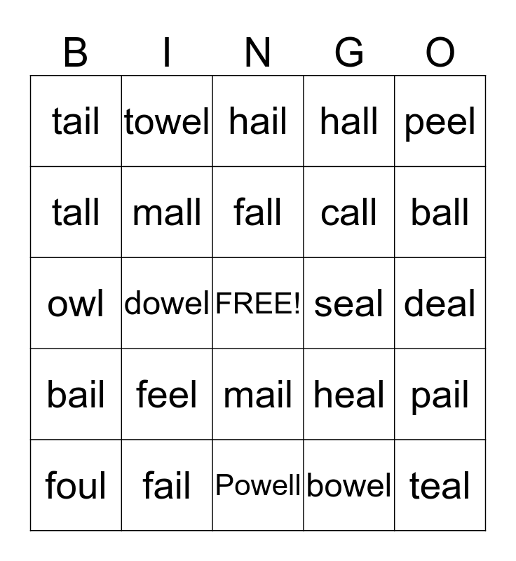 This bingo card has a free space and 24 words: feel, fail, fall, foul, peel, tail, tall, towel, seal, mail, call, owl, heal, pail, mall, bowel, deal, hail, ball, dowel, teal, bail, hall and Powell.