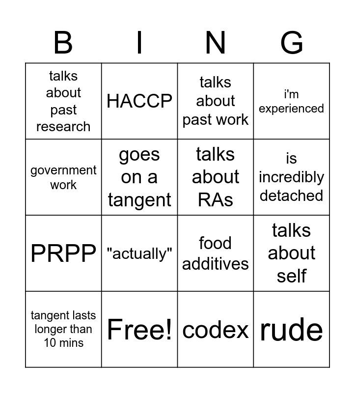 This bingo card has 16 words: Free!, talks about self, talks about past work, talks about past research, PRPP, HACCP, food additives, codex, government work, goes on a tangent, tangent lasts longer than 10 mins, i'm experienced, "actually", is incredibly detached, talks about RAs and rude.