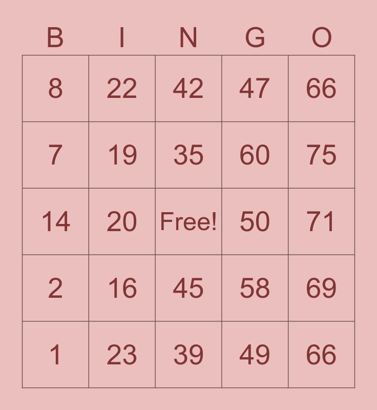 This bingo card has a free space and 24 words: 1, 16, 35, 49, 66, 8, 22, 42, 50, 71, 14, 19, 58, 69, 7, 23, 39, 47, 75, 2, 20, 45, 60 and 66.