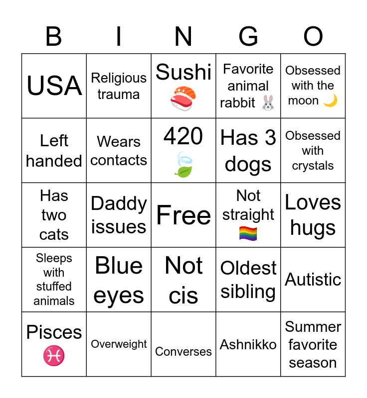 This bingo card has a free space and 24 words: Blue eyes, Overweight, 420🍃, Pisces ♓️, Obsessed with the moon 🌙, USA, Left handed, Religious trauma, Not straight 🏳️🌈, Not cis, Has 3 dogs, Has two cats, Oldest sibling, Autistic, Wears contacts, Ashnikko, Loves hugs, Sushi 🍣, Obsessed with crystals, Daddy issues, Summer favorite season, Sleeps with stuffed animals, Favorite animal rabbit 🐰 and Converses.