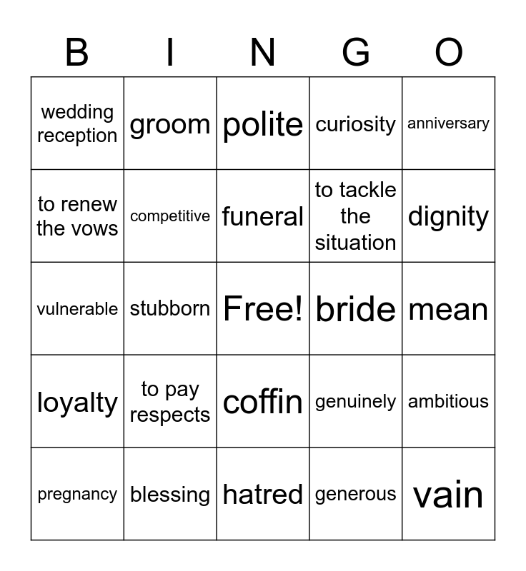 This bingo card has a free space and 24 words: to pay respects, blessing, funeral, pregnancy, anniversary, wedding reception, to renew the vows, groom, bride, coffin, to tackle the situation, vulnerable, genuinely, ambitious, competitive, generous, mean, polite, dignity, stubborn, vain, loyalty, curiosity and hatred.