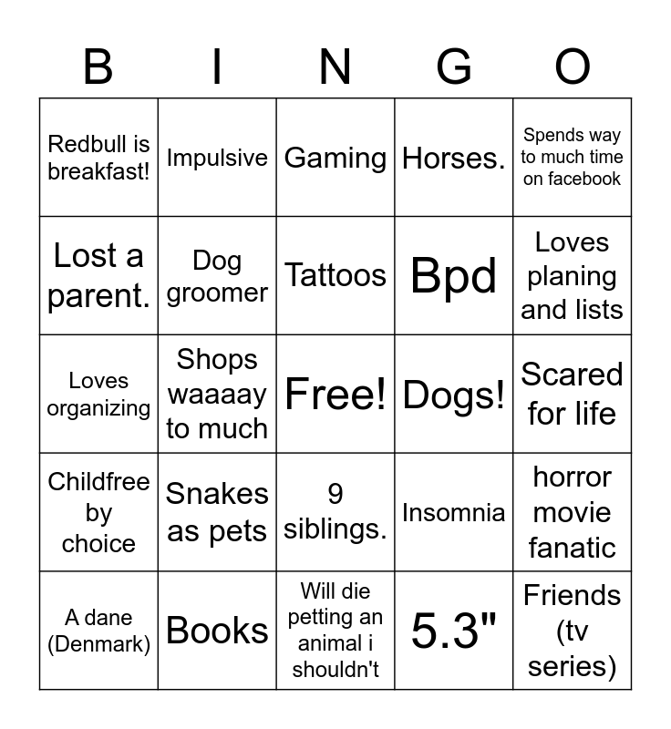 This bingo card has a free space and 24 words: Snakes as pets, Books, Tattoos, A dane (Denmark), Spends way to much time on facebook, Redbull is breakfast!, Lost a parent., Impulsive, Dogs!, 9 siblings., Bpd, Loves organizing, Insomnia, horror movie fanatic, Dog groomer, 5.3", Scared for life, Gaming, Loves planing and lists, Shops waaaay to much, Friends (tv series), Childfree by choice, Horses. and Will die petting an animal i shouldn't.