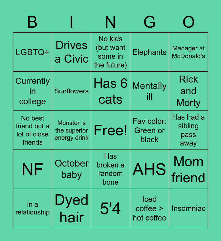 This bingo card has a free space and 24 words: October baby, Dyed hair, Has 6 cats, In a relationship, Manager at McDonald's, LGBTQ+, Currently in college, Drives a Civic, Fav color: Green or black, Has broken a random bone, Mentally ill, No best friend but a lot of close friends, AHS, Mom friend, Sunflowers, Iced coffee > hot coffee, Has had a sibling pass away, No kids (but want some in the future), Rick and Morty, Monster is the superior energy drink, Insomniac, NF, Elephants and 5'4.