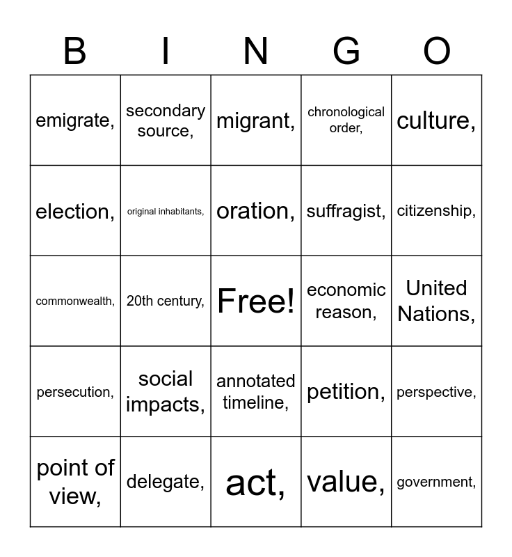 This bingo card has a free space and 97 words: democracy,, colonisation,, colony,, 20th century,, chronological,, chronology,, assimilate,, society,, refugee,, Saigon,, significant contribution,, historical,, inquiry,, persecution,, sequence,, emigrate,, culture,, cultural groups,, development,, communism,, diversity,, communist,, migrate,, ancestry,, immigrate,, oration,, point of view,, perspective,, populate or perish,, historical inquiry,, original inhabitants,, chronological order,, political reason,, political impact,, act,, annotated timeline,, artefact,, constitutional,, convention,, commonwealth,, constitutional monarchy,, United Nations,, wants,, value,, social impacts,, Stolen Generations,, social reason,, inauguration,, conference,, significance,, federal system,, immigrant,, guardianship,, refugee,, map,, timeline,, tariffs,, secondary source,, primary source,, empathy,, franchise,, event,, status,, census,, sources,, discrimination,, Congress,, constitution,, suffrage,, delegate,, suffragist,, referendum,, treaty,, population,, convention,, law,, judiciary,, colonial structure,, economic reason,, economic impact,, voting,, citizenship,, citizen,, nation,, trade,, monarch,, government,, rights,, republic,, parliament,, migrant,, migration,, culture,, petition,, election,, federation, and federate and Australia..