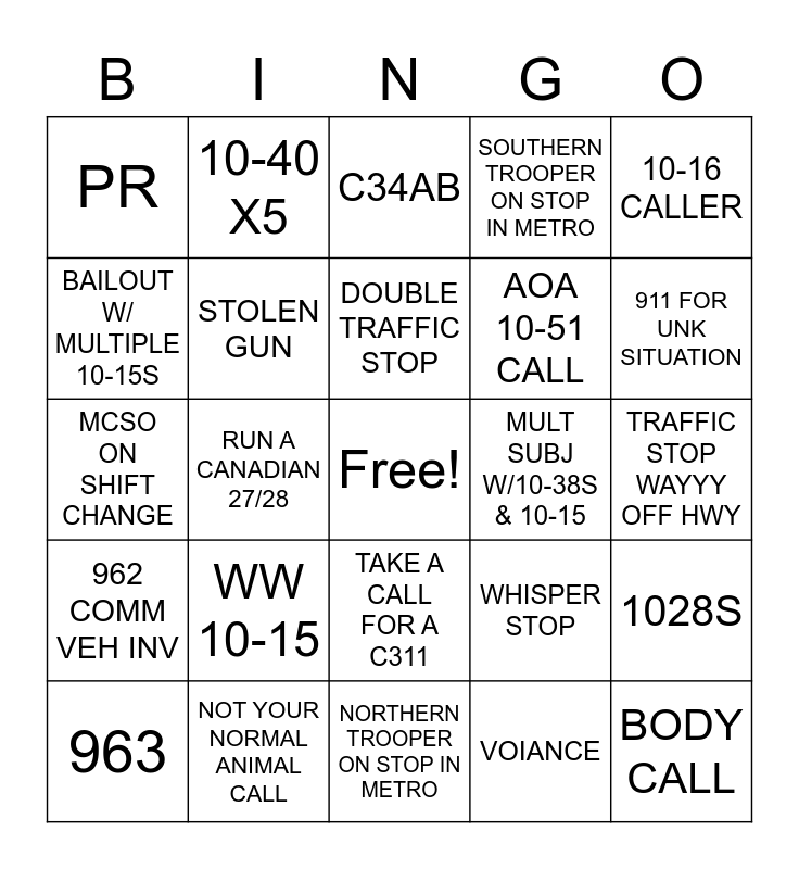 This bingo card has a free space and 24 words: WW 10-15, NOT YOUR NORMAL ANIMAL CALL, DOUBLE TRAFFIC STOP, 963, 10-16 CALLER, PR, BAILOUT W/ MULTIPLE 10-15S, 10-40 X5, MULT SUBJ W/10-38S & 10-15, TAKE A CALL FOR A C311, AOA 10-51 CALL, MCSO ON SHIFT CHANGE, WHISPER STOP, 1028S, STOLEN GUN, VOIANCE, TRAFFIC STOP WAYYY OFF HWY, C34AB, 911 FOR UNK SITUATION, RUN A CANADIAN 27/28, BODY CALL, 962 COMM VEH INV, SOUTHERN TROOPER ON STOP IN METRO and NORTHERN TROOPER ON STOP IN METRO.