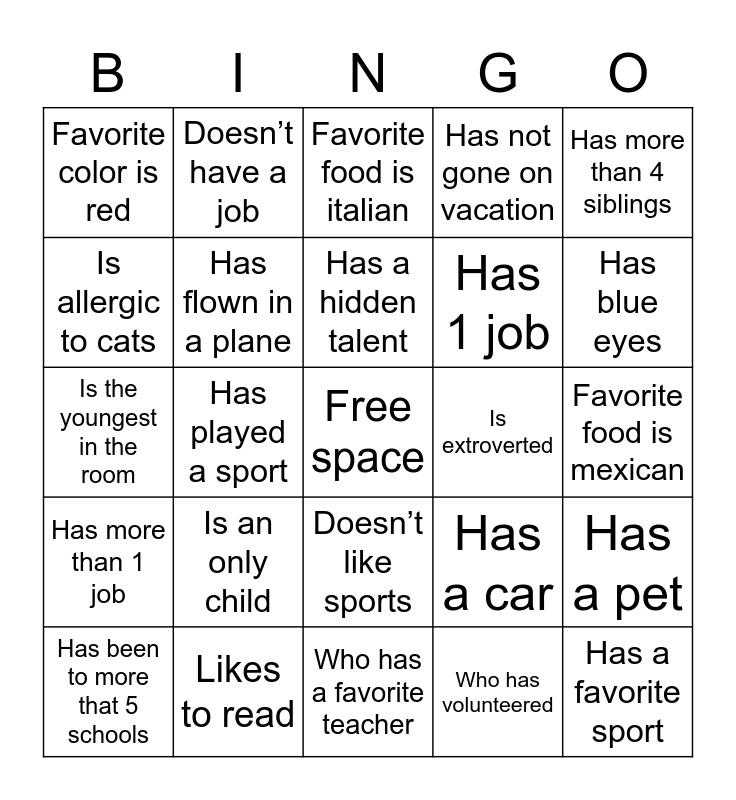 This bingo card has a free space and 29 words: Likes to fish, Likes to read, Favorite food is italian, Favorite color is blue, Has more than 4 siblings, Favorite color is red, Has flown in a plane, Has a hidden talent, Is extroverted, Has a pet, Has been to more that 5 schools, Has played a sport, Who has volunteered, Has a favorite sport, Is the youngest in the room, Likes to spend time alone, Who has a favorite teacher, Has a car, Has blue eyes, Has more than 1 job, Is an only child, Has taken a vacation, Has 1 job, Favorite food is mexican, Is allergic to cats, Doesn’t have a job, Doesn’t like sports, Has not gone on vacation and Likes school.