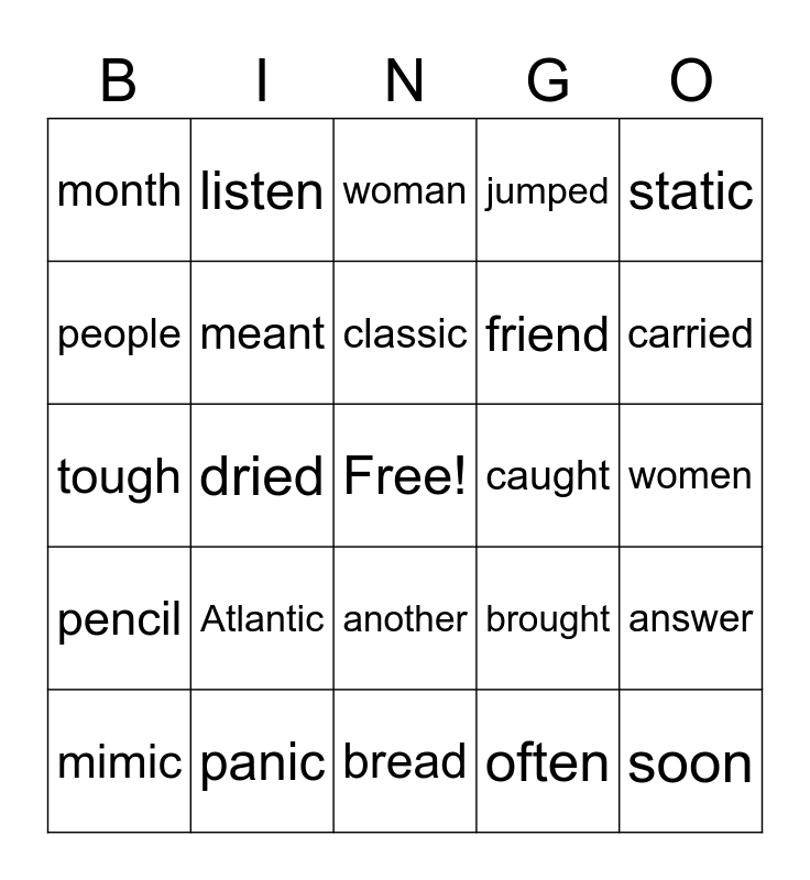 This bingo card has a free space and 24 words: Atlantic, panic, classic, mimic, static, month, people, listen, caught, another, friend, tough, brought, answer, meant, often, women, woman, carried, dried, soon, pencil, jumped and bread.
