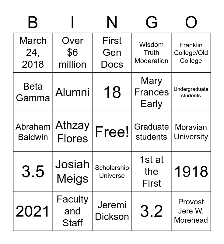 This bingo card has a free space and 24 words: Josiah Meigs, Faculty and Staff, 18, 2021, Franklin College/Old College, March 24, 2018, Beta Gamma, Over $6 million, Graduate students, Scholarship Universe, Mary Frances Early, Abraham Baldwin, 1st at the First, 1918, Alumni, 3.2, Moravian University, First Gen Docs, Undergraduate students, Athzay Flores, Provost Jere W. Morehead, 3.5, Wisdom Truth Moderation and Jeremi Dickson.
