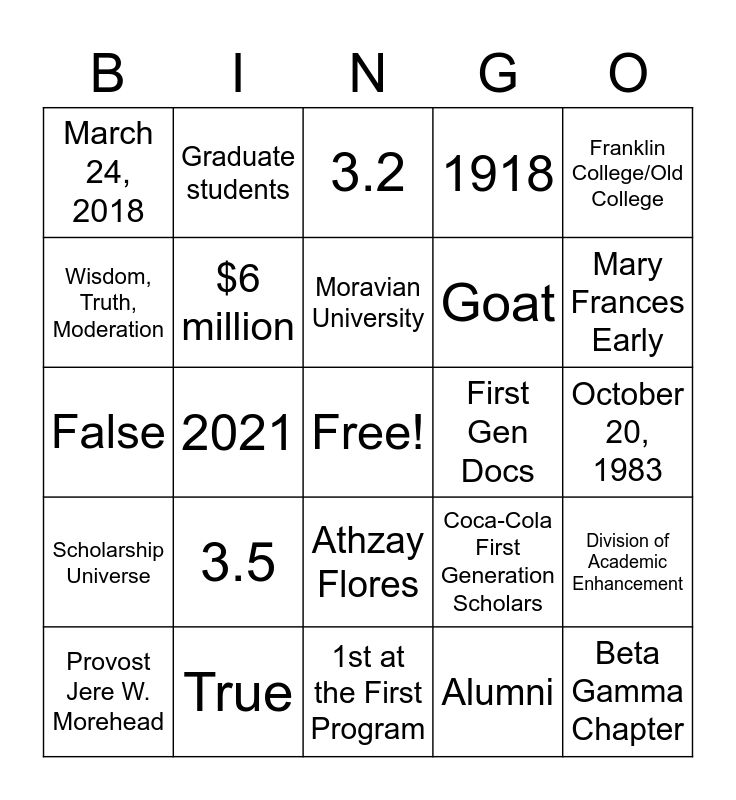 This bingo card has a free space and 37 words: Josiah Meigs, Undergraduate students, 18, $6 million, Division of Academic Enhancement, 3.5, Moravian University, Jeremi Dickson, Franklin College/Old College, January 1892, 2021, 1918, Beta Gamma Chapter, October 20, 1983, Wisdom, Truth, Moderation, Scholarship Universe, Abraham Baldwin, 3.2, Athzay Flores, First Gen Docs, March 24, 2018, Mary Frances Early, Provost Jere W. Morehead, 1st at the First Program, Faculty and Staff, Alumni, Graduate students, 2020, LaRen Morton, First Generation Handbook, February 1892, True, False, 8 million, Coca-Cola First Generation Scholars, Goat and 3.0.