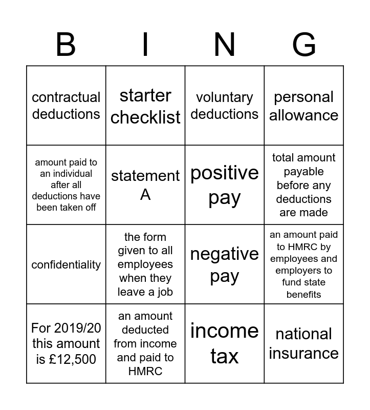 This bingo card has 41 words: Free!, negative pay, pay that is the same every payday, positive pay, pay that involves a payroll administrator entering details of hours worked etc., gross pay, total amount payable before any deductions are made, net pay, amount paid to an individual after all deductions have been taken off, national insurance, an amount paid to HMRC by employees and employers to fund state benefits, personal allowance, For 2019/20 this amount is £12,500, income tax, an amount deducted from income and paid to HMRC, statutory deductions, deductions from gross pay that are calculated according to legislation, contractual deductions, deductions from gross pay agreed between the employee and employer e.g. pension, voluntary deductions, deductions from gross pay authorised by the employee, accuracy and timeliness, all payroll staff must operate with upmost consideration of these factors, confidentiality, non-disclosure of information unless instructed to do so by HMRC or legally, fraud, the potential for fake payments to be made, P45, the form given to all employees when they leave a job, P60, a summery of all pay and deductions made each tax year, starter checklist, the document that must be completed if an employee does not have a P45, free pay, the amount that can be earned before tax is deducted from gross pay, statement A, the statement ticked if someone has not had a job in that tax year, statement B, the statement ticked if someone has had another job within that tax year, statement C and the statement ticked if someone is taking on a second job.