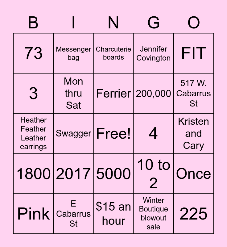 This bingo card has a free space and 24 words: 2017, E Cabarrus St, Ferrier, Pink, FIT, 73, 3, Messenger bag, 4, 5000, 200,000, Heather Feather Leather earrings, 10 to 2, Once, Mon thru Sat, Winter Boutique blowout sale, Kristen and Cary, Charcuterie boards, 517 W. Cabarrus St, Swagger, 225, 1800, Jennifer Covington and $15 an hour.