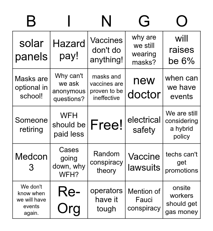 This bingo card has a free space and 24 words: Cases going down, why WFH?, Re-Org, masks and vaccines are proven to be ineffective, We don't know when we will have events again., will raises be 6%, solar panels, Masks are optional in school!, Hazard pay!, electrical safety, Random conspiracy theory, new doctor, Someone retiring, Vaccine lawsuits, techs can't get promotions, Why can't we ask anonymous questions?, Mention of Fauci conspiracy, We are still considering a hybrid policy, Vaccines don't do anything!, when can we have events, WFH should be paid less, onsite workers should get gas money, Medcon 3, why are we still wearing masks? and operators have it tough.