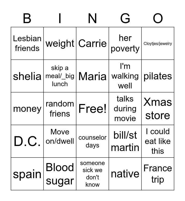 This bingo card has a free space and 24 words: Move on/dwell, Blood sugar, Maria, spain, Cloytjes/jewelry, Lesbian friends, shelia, weight, talks during movie, counselor days, I'm walking well, money, bill/st martin, I could eat like this, skip a meal/_big lunch, native, Xmas store, Carrie, pilates, random friens, France trip, D.C., her poverty and someone sick we don't know.