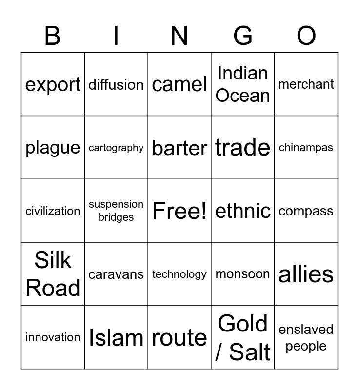 This bingo card has a free space and 25 words: caravans, route, barter, innovation, merchant, export, plague, diffusion, ethnic, technology, trade, civilization, monsoon, allies, cartography, lateen sail, compass, camel, chinampas, suspension bridges, enslaved people, Islam, Silk Road, Indian Ocean and Gold / Salt.