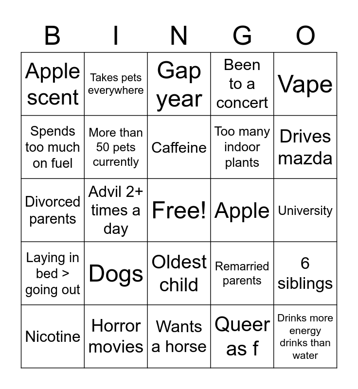 This bingo card has a free space and 24 words: Dogs, Horror movies, Caffeine, Nicotine, Vape, Apple scent, Spends too much on fuel, Takes pets everywhere, Apple, Oldest child, Too many indoor plants, Divorced parents, Remarried parents, 6 siblings, More than 50 pets currently, Queer as f, University, Gap year, Drives mazda, Advil 2+ times a day, Drinks more energy drinks than water, Laying in bed > going out, Been to a concert and Wants a horse.