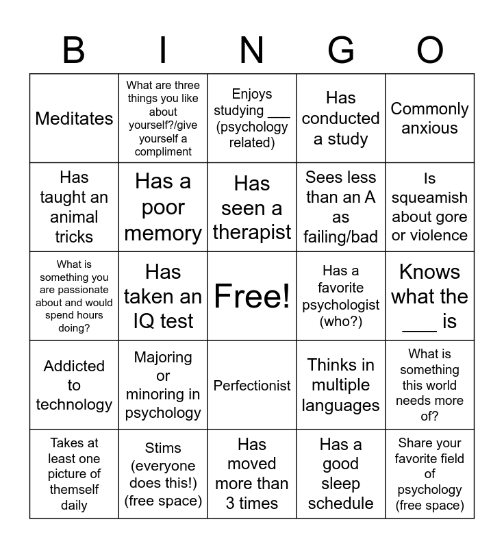 This bingo card has a free space and 39 words: Plays violent video games, Commonly has lucid dreams, Is left-handed, Has a poor memory, Takes at least one picture of themself daily, Perfectionist, Has seen a therapist, Commonly late to class, Commonly anxious, Addicted to technology, Has taken an IQ test, Has conducted a study, Share your favorite field of psychology (free space), Knows what the ___ is, Has a favorite psychologist (who?), Majoring or minoring in psychology, Has experienced burnout, Meditates, Has watched Youtube before the age of 10, Thinks in multiple languages, Has taught an animal tricks, Has moved more than 3 times, Sees less than an A as failing/bad, Is squeamish about gore or violence, Has difficulty describing/explaining emotions, Did not live in the nuclear family, Has trained their breath for singing, swimming, yoga, etc, Stand up and have the group give applause, What do you see as a positive relationship?, What are three things you like about yourself?/give yourself a compliment, List three biggest fears, Drank water today and had a good lunch or breakfast, Enjoys studying ___ (psychology related), Stims (everyone does this!) (free space), Has a good sleep schedule, Has pulled an all-nighter, What is something this world needs more of?, What is something you are passionate about and would spend hours doing? and What is your love language?.