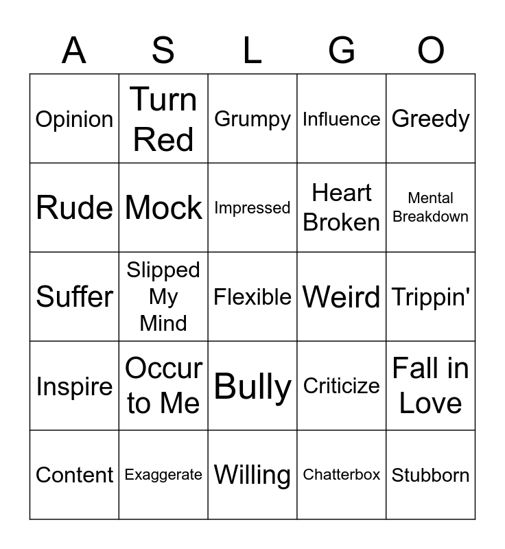 This bingo card has 31 words: Willing, Love, Slipped My Mind, Pick On, Opinion, Grumpy, Mock, Criticize, Weird, Chatterbox, Trippin', Flexible, Stubborn, Close Minded, Mental Breakdown, Real, Fall in Love, Occur to Me, Inspire, Bully, Greedy, Value, Content, Turn Red, Heart Broken, Rude, Influence, Suffer, Exaggerate, Impressed and Private.
