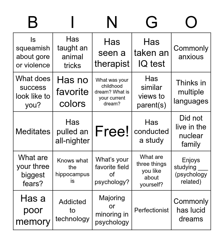 This bingo card has a free space and 45 words: Plays violent video games, Commonly has lucid dreams, Is left-handed, Has a poor memory, Takes at least one picture of themself daily, Perfectionist, Has seen a therapist, Commonly late to class, Commonly anxious, Addicted to technology, Has taken an IQ test, Has conducted a study, What’s your favorite field of psychology?, Knows what the hippocampus is, Has a favorite psychologist, Majoring or minoring in psychology, Has experienced burnout, Meditates, Has watched Youtube before the age of 10, Thinks in multiple languages, Has taught an animal tricks, Has moved more than 3 times, Sees less than an A as failing, Is squeamish about gore or violence, Has difficulty describing/explaining emotions, Did not live in the nuclear family, Has trained their breath for singing, swimming, yoga, etc, What do you see as a positive relationship?, What are three things you like about yourself?, What are your three biggest fears?, Drank water today and had a good lunch or breakfast, Enjoys studying ___ (psychology related), Has a fun psychology fact, Stims (everyone does this!), Has a good sleep schedule, Has pulled an all-nighter, What is something this world needs more of?, What is something you are passionate about and would spend hours doing?, What is your love language?, What was your childhood dream? What is your current dream?, What does success look like to you?, Has similar views to parent(s), Enjoys arguing/debating, Has no favorite colors and Opens up the wrong app when trying to find another.