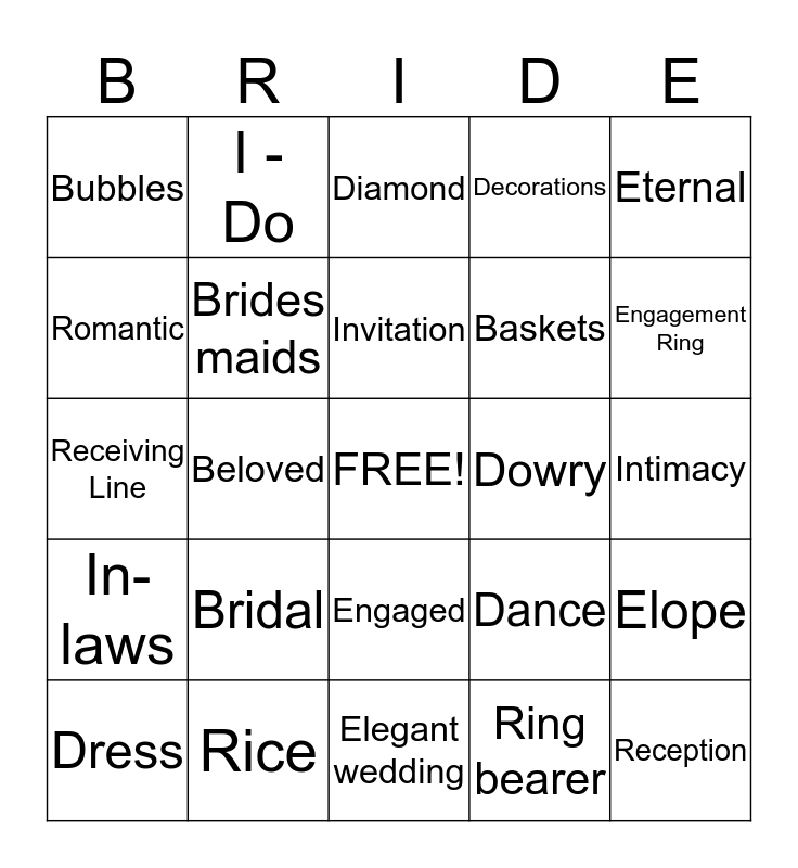 This bingo card has a free space and 24 words: Bridal, Rice, Invitation, Dress, Eternal, Bubbles, Romantic, I - Do, Dowry, Engaged, Baskets, Receiving Line, Dance, Elope, Brides maids, Ring bearer, Intimacy, Diamond, Engagement Ring, Beloved, Reception, In-laws, Decorations and Elegant wedding.