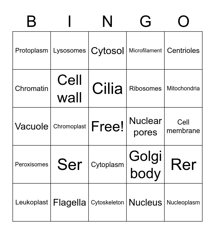 This bingo card has a free space and 24 words: Ser, Flagella, Cilia, Leukoplast, Centrioles, Protoplasm, Chromatin, Lysosomes, Nuclear pores, Cytoplasm, Ribosomes, Vacuole, Golgi body, Rer, Cell wall, Nucleus, Cell membrane, Cytosol, Mitochondria, Chromoplast, Nucleoplasm, Peroxisomes, Microfilament and Cytoskeleton.