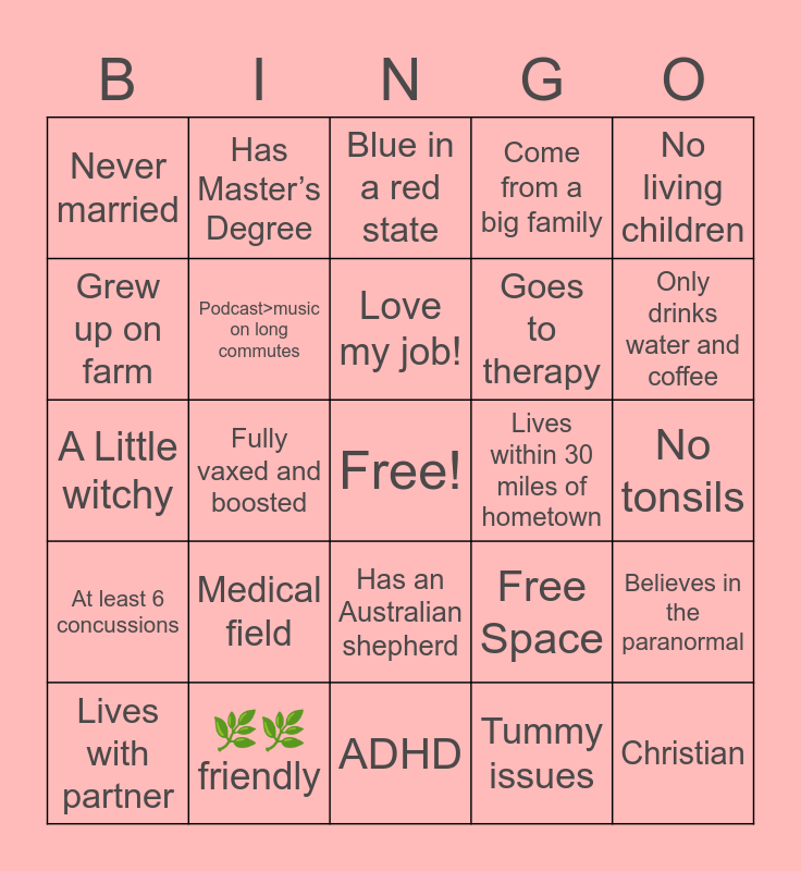 This bingo card has a free space and 25 words: Medical field, ADHD, Love my job!, Lives with partner, No living children, Never married, Grew up on farm, Has Master’s Degree, Lives within 30 miles of hometown, Has an Australian shepherd, Goes to therapy, A Little witchy, Free Space, Believes in the paranormal, Podcast>music on long commutes, Can “read” in IPA, No tonsils, Blue in a red state, Only drinks water and coffee, Fully vaxed and boosted, Christian, 🌿🌿 friendly, At least 6 concussions, Come from a big family and Tummy issues.
