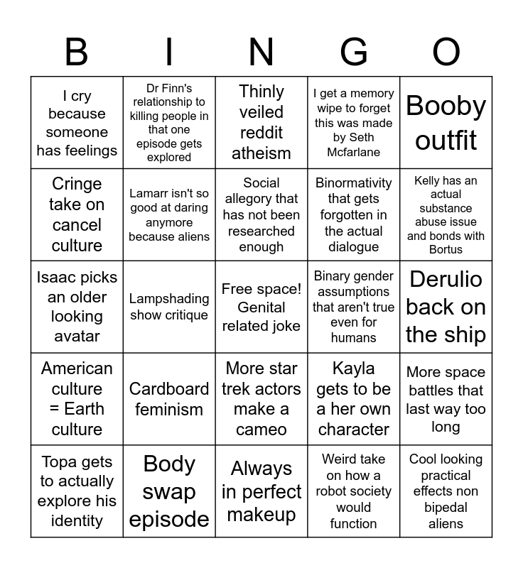 This bingo card has a free space and 24 words: Cardboard feminism, Body swap episode, Social allegory that has not been researched enough, Topa gets to actually explore his identity, Booby outfit, I cry because someone has feelings, Cringe take on cancel culture, Dr Finn's relationship to killing people in that one episode gets explored, Binary gender assumptions that aren't true even for humans, More star trek actors make a cameo, Binormativity that gets forgotten in the actual dialogue, Isaac picks an older looking avatar, Kayla gets to be a her own character, More space battles that last way too long, Lamarr isn't so good at daring anymore because aliens, Weird take on how a robot society would function, Derulio back on the ship, Thinly veiled reddit atheism, Kelly has an actual substance abuse issue and bonds with Bortus, Lampshading show critique, Cool looking practical effects non bipedal aliens, American culture = Earth culture, I get a memory wipe to forget this was made by Seth Mcfarlane and Always in perfect makeup.