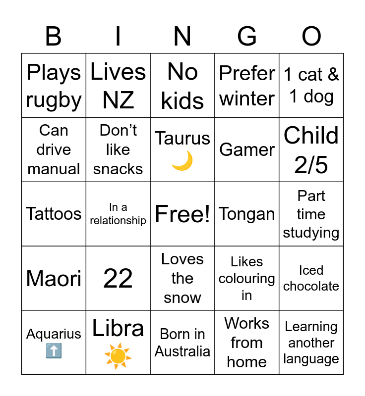 This bingo card has a free space and 24 words: 22, Libra ☀️, Taurus 🌙, Aquarius ⬆️, 1 cat & 1 dog, Plays rugby, Can drive manual, Lives NZ, Tongan, Loves the snow, Gamer, Tattoos, Likes colouring in, Iced chocolate, Don’t like snacks, Works from home, Part time studying, No kids, Child 2/5, In a relationship, Learning another language, Maori, Prefer winter and Born in Australia.