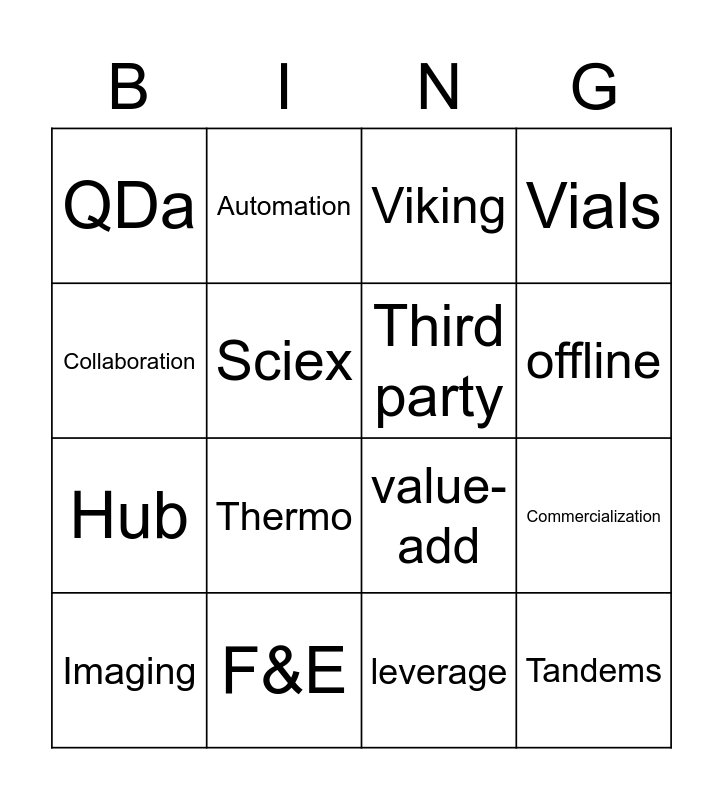This bingo card has 87 words: Free!, accountability, actionable, ballpark, best practice, big picture, customer-centric, customer-focused, empower, end-to-end, going forward, industry-leading, impactful, leverage, next generation, offline, prioritize, strategic fit, strategic gap, townhall, turnkey solution, validate, value-add, value proposition, visibility, world class, indomitable, firecrow, premier, clover, magpie, kronos, Arc, Acquity, Sciex, Agilent, Thermo, Mass-spec, Outside in, Commercialization, Competitive, Pharma, BioPharma, F&E, Clinical, Collaboration, Cross Functional, Automation, Waters_connect, MassLynx, UNIFI, Empower, Tandems, TOFS, High-Res, Impact, Hub, Acquity, Columns, Vials, Third party, Strategy, cMRT, Atlas, Partners, Bioprocessing, Sartorius, DESI, Imaging, Magpie, Pathfinder, Pteropus, Viking, Intact Mass, Sequencing, BioAccord, RDa, Routine Quan, Method transfer, CRO, Sales force, Compass, Account managers, QRB, Financials, QDa and Single quads.