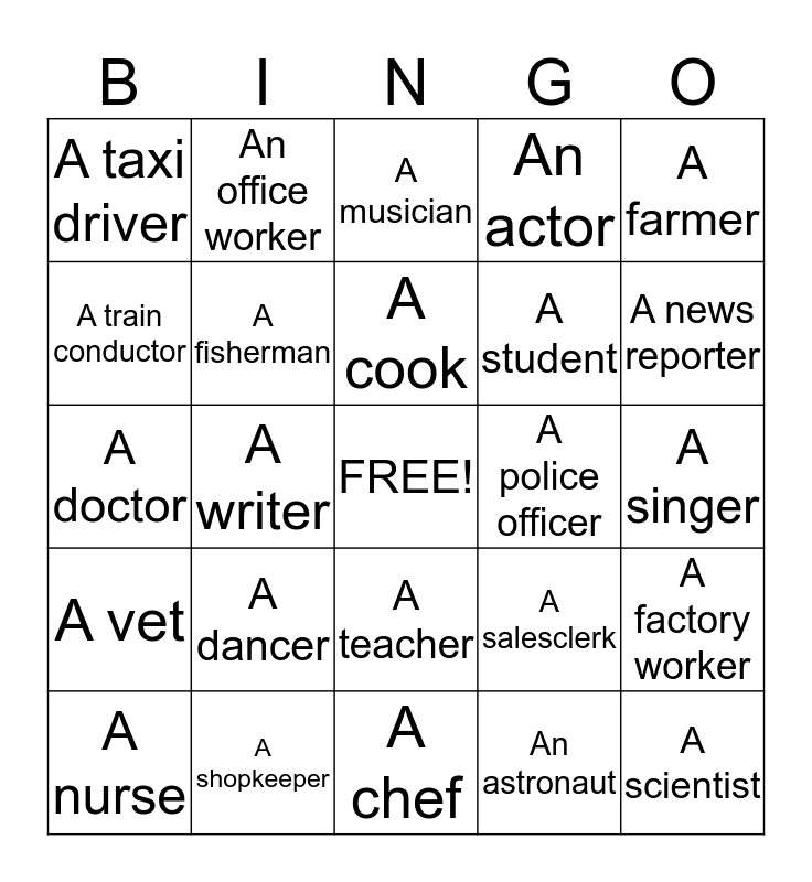 This bingo card has a free space and 24 words: A dancer, A shopkeeper, A cook, A nurse, A farmer, A taxi driver, A train conductor, An office worker, A police officer, A teacher, A student, A doctor, A salesclerk, A factory worker, A fisherman, An astronaut, A singer, A musician, A news reporter, A writer, A scientist, A vet, An actor and A chef.