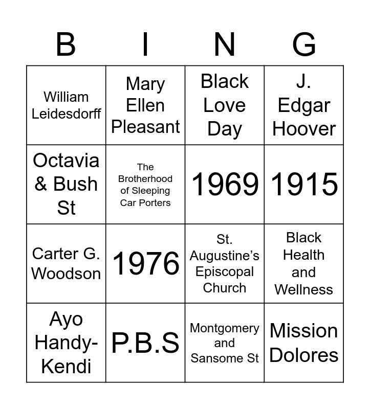 This bingo card has 16 words: P.B.S, Black Health and Wellness, Black Love Day, William Leidesdorff, Carter G. Woodson, Mary Ellen Pleasant, St. Augustine’s Episcopal Church, Montgomery and Sansome St, Octavia & Bush St, The Brotherhood of Sleeping Car Porters, Ayo Handy-Kendi, J. Edgar Hoover, 1976, 1915, 1969 and Mission Dolores.