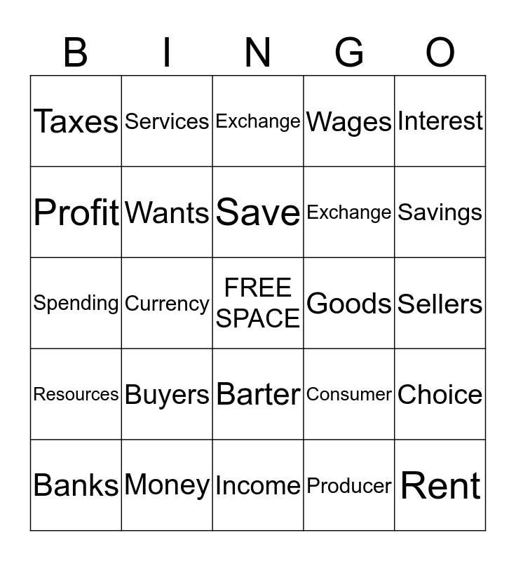 This bingo card has a free space and 24 words: Buyers, Money, Save, Banks, Interest, Taxes, Profit, Services, Goods, Barter, Exchange, Spending, Consumer, Choice, Wants, Producer, Sellers, Exchange, Savings, Currency, Rent, Resources, Wages and Income.