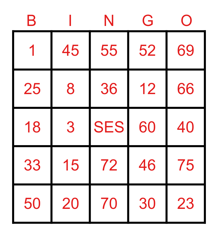 This bingo card has a free space and 24 words: 15, 20, 36, 50, 69, 1, 25, 45, 60, 72, 12, 18, 46, 75, 8, 30, 40, 55, 66, 3, 23, 33, 52 and 70.