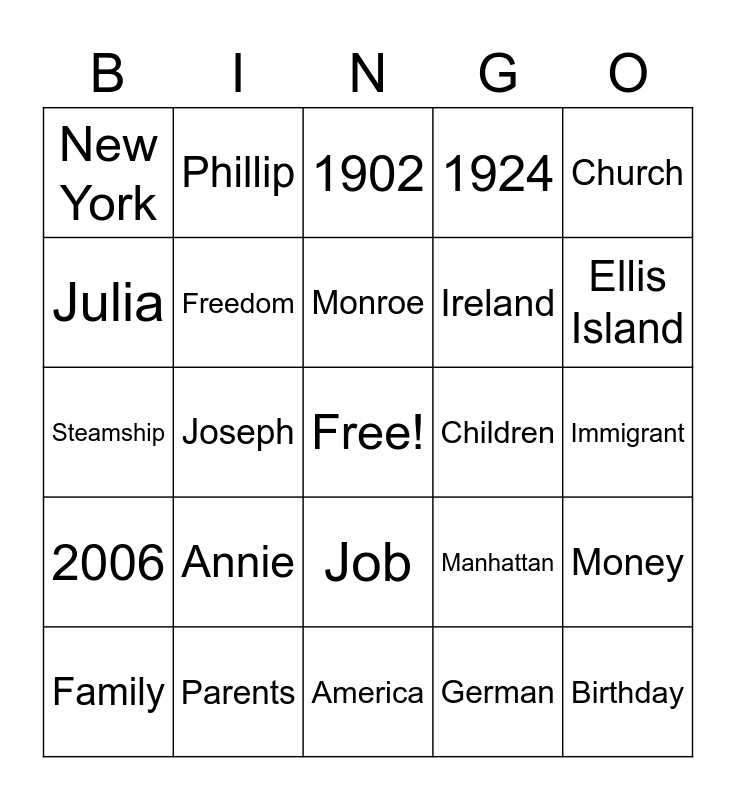 This bingo card has a free space and 24 words: Annie, Parents, Monroe, Family, Church, New York, Julia, Phillip, Children, Job, Ireland, Steamship, Manhattan, Money, Freedom, German, Immigrant, 1902, Ellis Island, Joseph, Birthday, 2006, 1924 and America.
