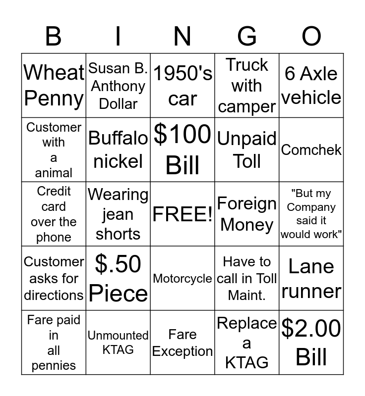 This bingo card has a free space and 24 words: $.50 Piece, Unmounted KTAG, $100 Bill, Fare paid in all pennies, 6 Axle vehicle, Wheat Penny, Customer with a animal, Susan B. Anthony Dollar, Foreign Money, Motorcycle, Unpaid Toll, Credit card over the phone, Have to call in Toll Maint., Lane runner, Buffalo nickel, Replace a KTAG, "But my Company said it would work", 1950's car, Comchek, Wearing jean shorts, $2.00 Bill, Customer asks for directions, Truck with camper and Fare Exception.