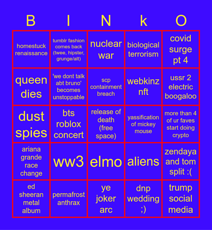This bingo card has a free space and 24 words: ww3, permafrost anthrax, scp containment breach, ed sheeran metal album, covid surge pt 4, homestuck renaissance, queen dies, tumblr fashion comes back (twee, hipster, grunge/alt), yassification of mickey mouse, elmo, webkinz nft, dust spies, aliens, zendaya and tom split :(, 'we dont talk abt bruno' becomes unstoppable, dnp wedding ;), more than 4 of ur faves start doing crypto, nuclear war, ussr 2 electric boogaloo, bts roblox concert, trump social media, ariana grande race change, biological terrorism and ye joker arc.