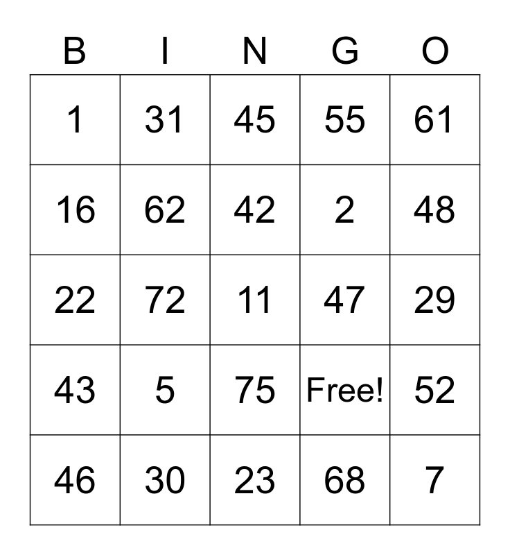 This bingo card has 25 words: 5, 23, 42, 46, 61, 1, 16, 31, 47, 75, 2, 22, Free!, 52, 62, 7, 29, 45, 48, 72, 11, 30, 43, 55 and 68.