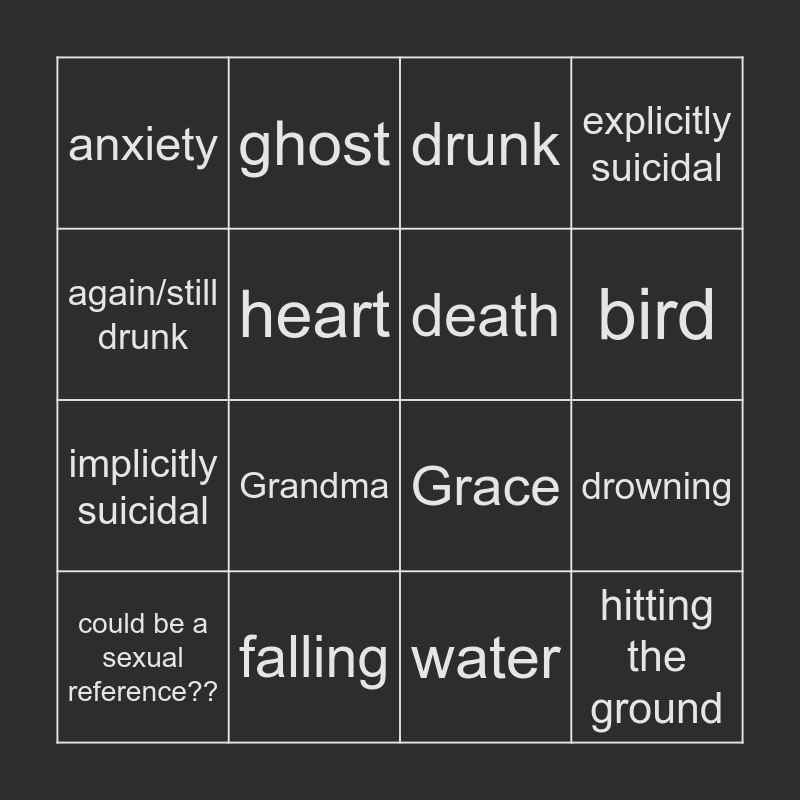 This bingo card has 16 words: falling, drowning, drunk, anxiety, implicitly suicidal, ghost, Grace, water, again/still drunk, heart, could be a sexual reference??, explicitly suicidal, Grandma, bird, death and hitting the ground.
