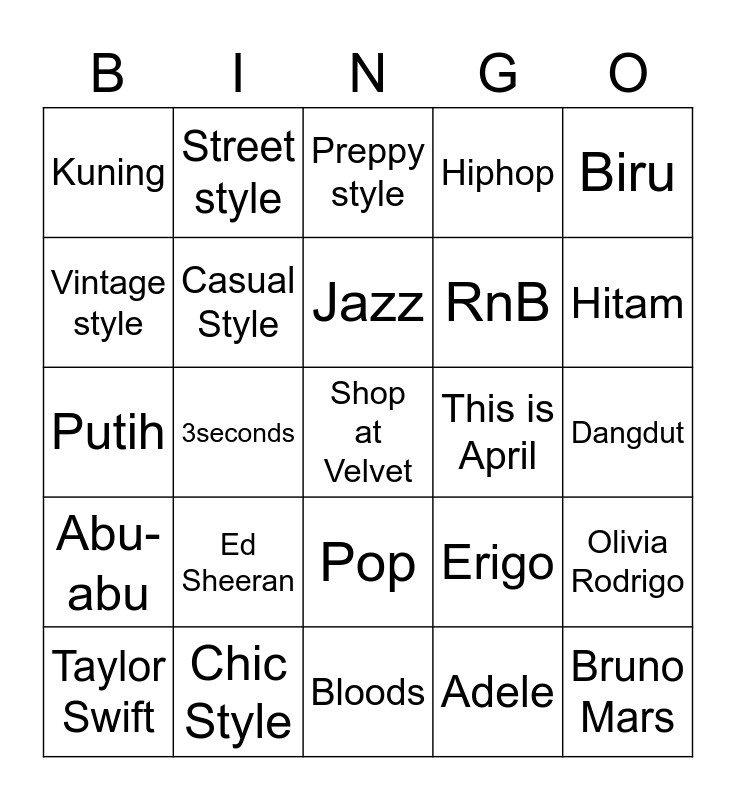 This bingo card has 25 words: Ed Sheeran, Bloods, Jazz, Taylor Swift, Biru, Kuning, Vintage style, Street style, This is April, Pop, RnB, Putih, Erigo, Olivia Rodrigo, Casual Style, Bruno Mars, Dangdut, Preppy style, Hitam, 3seconds, Shop at Velvet, Chic Style, Abu-abu, Hiphop and Adele.