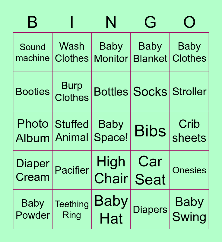 This bingo card has a free space and 24 words: Pacifier, Teething Ring, Bottles, Baby Powder, Baby Clothes, Sound machine, Booties, Wash Clothes, Bibs, High Chair, Socks, Photo Album, Car Seat, Onesies, Burp Clothes, Diapers, Crib sheets, Baby Monitor, Stroller, Stuffed Animal, Baby Swing, Diaper Cream, Baby Blanket and Baby Hat.