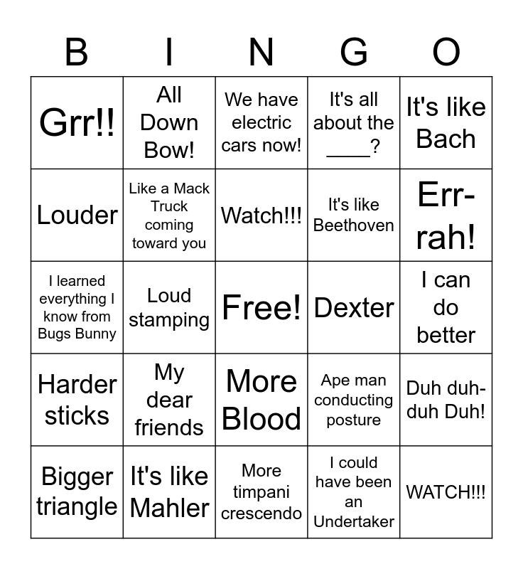 This bingo card has a free space and 24 words: My dear friends, It's like Mahler, Watch!!!, Bigger triangle, It's like Bach, Grr!!, Louder, All Down Bow!, Dexter, More Blood, It's like Beethoven, I learned everything I know from Bugs Bunny, Ape man conducting posture, Duh duh-duh Duh!, Like a Mack Truck coming toward you, I could have been an Undertaker, I can do better, We have electric cars now!, Err-rah!, Loud stamping, WATCH!!!, Harder sticks, It's all about the ____? and More timpani crescendo.