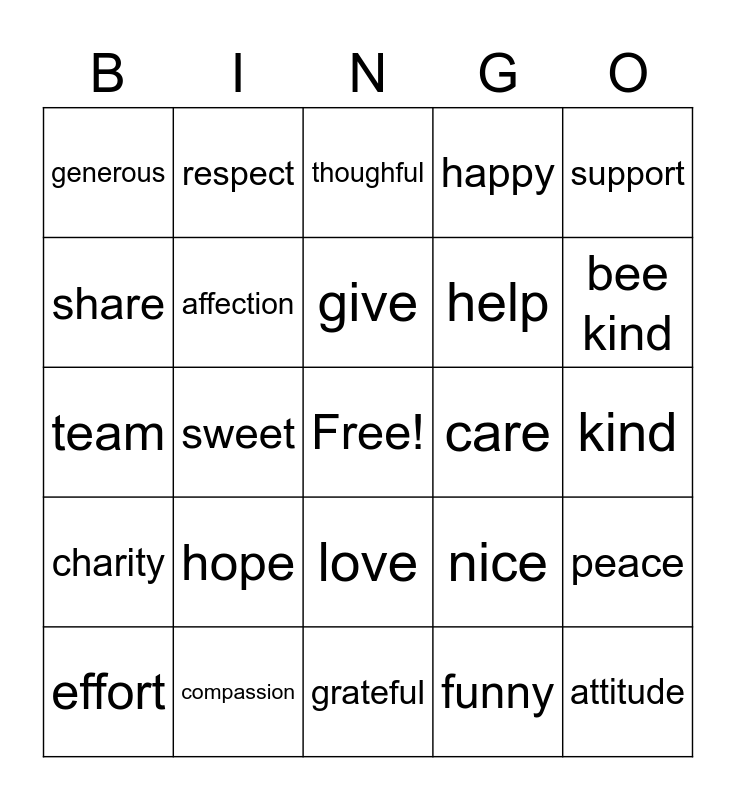 This bingo card has a free space and 26 words: love, funny, give, compassion, support, generous, share, respect, kind, nice, help, team, peace, effort, sweet, friendly, happy, charity, thoughful, attitude, bee kind, grateful, care, hope, affection and pink.