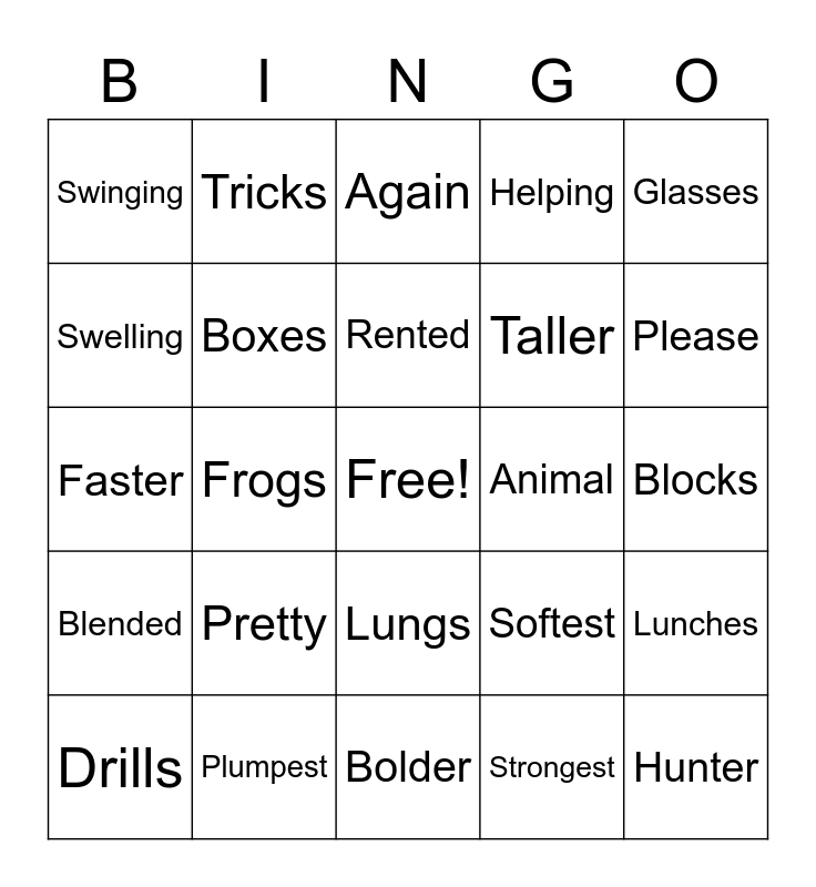 This bingo card has a free space and 24 words: Pretty, Plumpest, Rented, Drills, Glasses, Swinging, Swelling, Tricks, Animal, Lungs, Taller, Faster, Softest, Lunches, Boxes, Strongest, Blocks, Again, Please, Frogs, Hunter, Blended, Helping and Bolder.