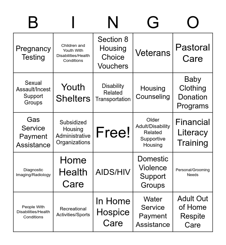 This bingo card has a free space and 290 words: Food Pantries, Low Income/Subsidized Private Rental Housing, Veterans, Government Subsidized Private Rental Housing Listings, Domestic Violence Issues, Fire Prevention Information, Fire Stations, Disaster Equipment and Supplies, Firefighters, COVID-19, Senior Centers, Veteran Benefits Assistance, Section 8/Rental Assistance Program Rental Listings, Comprehensive Information and Referral, Public Libraries, Youth, Fire Services, Electric Service Payment Assistance, Rent Payment Assistance, Administration Volunteer Opportunities, Gas Service Payment Assistance, Section 8 Housing Choice Vouchers, Congregate Meals/Nutrition Sites, Domestic Violence Shelters, Mayors Offices, Older Adults, Domestic Violence Intervention Programs, Safe Havens for Abandoned Newborns, State Parks, Home Delivered Meals, Specialized Information and Referral, Thrift Shops, Hiking Trails, General Clothing Provision, Judges/Magistrates, Advocacy, COVID-19 Diagnostic Tests, Boys/Girls Clubs, Developmental Disabilities, Case/Care Management, Comprehensive Outpatient Substance Use Disorder Treatment, Marriage Licenses, Community Clinics, After School Meal Programs, City/County Parks, Sexual Assault Issues, Recreational Activities/Sports, Individual Counseling, General Counseling Services, Youth Enrichment Programs, Transitional Housing/Shelter, Subsidized Housing Administrative Organizations, 911 Services, Service Clubs, Older Adult/Disability Related Supportive Housing, Local Tax Collection Agencies, Guardians ad Litem, General Dentistry, Cancer, Marshals Offices, County Government Departments/Offices, Non-Emergency Medical Transportation, Park Museums and Visitor Centers, Heating Fuel Payment Assistance, Crime Investigation, Prescription Expense Assistance, Community Shelters, Water Service Payment Assistance, Child Advocacy Centers, Job Finding Assistance, Parenting Skills Classes, Low Income, Diapers, Law Enforcement Records/Files, Adult Basic Education, COVID-19 Control, General Health Education Programs, Pregnancy Counseling, Undesignated Temporary Financial Assistance, Leadership Development, Group Counseling, Public Internet Access Sites, Children, Domestic/Family Violence Legal Services, Pregnancy Testing, Physical Therapy, Family Counseling, Federated Giving Programs, Homeless People, Farmers Markets, Protective/Restraining Orders, Head Start, Cancer Detection, Speech and Language Pathology, Child Care Centers, Humanities Activities/Events, Municipal Police, Elementary Schools, General Medical Care, Career Development, Animal Shelters, Supported Living Services for Adults With Disabilities, Patients, People With Disabilities/Health Conditions, Subsidized Home Acquisition, Personal/Grooming Needs, Senior Ride Programs, Court Filing Offices, Drug Crime Reporting, English as a Second Language, School Supplies, Nutrition Education, Home/Community Based Developmental Disabilities Programs, Christmas Programs, Life Skills Education, Camps, Mental Health Evaluation, Diabetes, Commodity Supplemental Food Program, Homelessness Prevention Programs, Public Defender, School Districts, Scholarships, Occupational Therapy, Home Health Care, In Home Hospice Care, Thanksgiving Programs, Domestic Violence Support Groups, Breast Cancer, Disaster/Emergency Issues, School Closure Related Breakfast/Lunch Services, Energy/Water Conservation Improvements, Gas Money, Driver Licenses, Motor Vehicle Tax Information, Early Head Start, Secondary/High Schools, First Aid Instruction, Prenatal Care, Urgent Care Centers, Independent Living Skills Instruction, Hospice Facilities, Supported Employment, State Medicaid Waiver Programs, Parenting Materials, Computer Literacy Training Programs, Child/Adolescent Residential Treatment Facilities, Domestic Violence Hotlines, County Clerk of the Courts Offices, Workshops/Symposiums, Adolescents, Visual Impairments, Youth Shelters, Mortgage Payment Assistance, General Paratransit/Community Ride Programs, Motor Vehicle Registration, Notary Signature Registration/Validation, Spouse/Intimate Partner Abuse Prevention, Sexual Assault Prevention, Diagnostic Imaging/Radiology, Blood Pressure Screening, Sexually Transmitted Disease Screening, Childbirth Education, Early Intervention for Children With Disabilities/Delays, Diabetes Management Clinics, Sexual Assault Treatment, COVID-19 Immunization Clinics, Pediatrics, Adoption Information/Referrals, General Addictions/Substance Use Disorder Support Groups, Caregiver/Care Receiver Support Groups, Special Event Support Volunteer Opportunities, Abuse Counseling, Theater Performances, County Executive Offices, Disaster Related Clothing/Emergency Supplies, Baby Clothing Donation Programs, Food Donation Programs, Book Loan, Directory/Resource List Publication, Food Banks/Food Distribution Warehouses, Housing Related Coordinated Entry, Land Records, Crime Victim Accompaniment Services, Emergency Room Care, AIDS/HIV Prevention Counseling, Medical Care Expense Assistance, Skilled Nursing Facilities, Pediatric Dentistry, Obstetrics/Gynecology, Adult/Child Mentoring Programs, Sexual Assault/Incest Support Groups, Health/Disability Related Support Groups, Scouting Programs, Disaster/Emergency Services Volunteer Opportunities, Outpatient Mental Health Facilities, Anger Management, Bereavement Counseling, Substance Use Disorder Counseling, Reference/Information, College/University Students, Native American Community, Rapid Re-Housing Programs, Home Rehabilitation Programs, Home Purchase/Mortgage Refinance Loans, Baby Clothing, Driver License Testing Sites, Financial Literacy Training, Prisoner Transport, School Readiness Programs, Homework Help Programs, HIV Testing, Medical Equipment/Supplies, Prescription Drug Patient Assistance Programs, Women's Health Centers, Inpatient Rehabilitation, AIDS/HIV Clinics, Senior Companion Program, Personal Care, Expectant/New Parent Assistance, Special Events, Faith Based Counseling, Child Guida